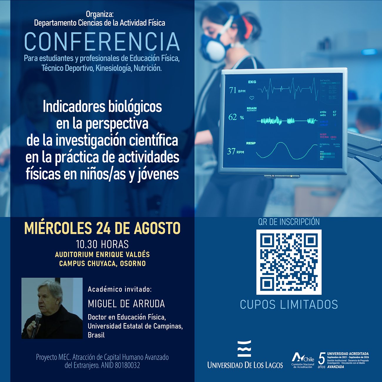 La conferencia se llevará a cabo el día 24 de agosto a las 10:30 hrs. en el auditorio Enrique Valdés del Campus Osorno y está dirigida a estudiantes de la carrera Pedagogía en Educación Media mención Educación Física, del Programa de Prosecución de Estudios en Educación Física, Técnico Deportivo, Kinesiología, Nutrición y a la comunidad en general.